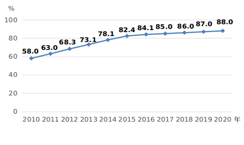 3.農(nóng)村人居環(huán)境持續(xù)改善。2018年,中央農(nóng)辦等18個(gè)部門聯(lián)合印發(fā)《農(nóng)村人居環(huán)境整治村莊清潔行動(dòng)方案》,啟動(dòng)并實(shí)施村莊清潔行動(dòng),目前農(nóng)村人居環(huán)境整治三年行動(dòng)方案目標(biāo)任務(wù)全面完成。全國(guó)95%以上的村莊開展了清潔行動(dòng),村民的環(huán)境與健康意識(shí)進(jìn)一步增強(qiáng),村莊環(huán)境趨于干凈整潔。2020年,農(nóng)村集中式供水受益人口比重達(dá)到88.0%,比2010年提高30個(gè)百分點(diǎn),實(shí)現(xiàn)《綱要》“達(dá)到85%左右”的目標(biāo)(見圖8)。