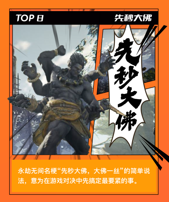 “先秒大佛”源自于《永劫無間》中的游戲角色天海和尚,人物釋放技能會變身成為一樽巨大的佛僧(故稱為“大佛”)且具有極強(qiáng)的戰(zhàn)斗力,所以玩家們在游戲中碰到大佛后,通常會在其血量見底時互相溝通“先秒大佛”。這個詞也可以引申意思也可以是快速搞定最重要的事情。