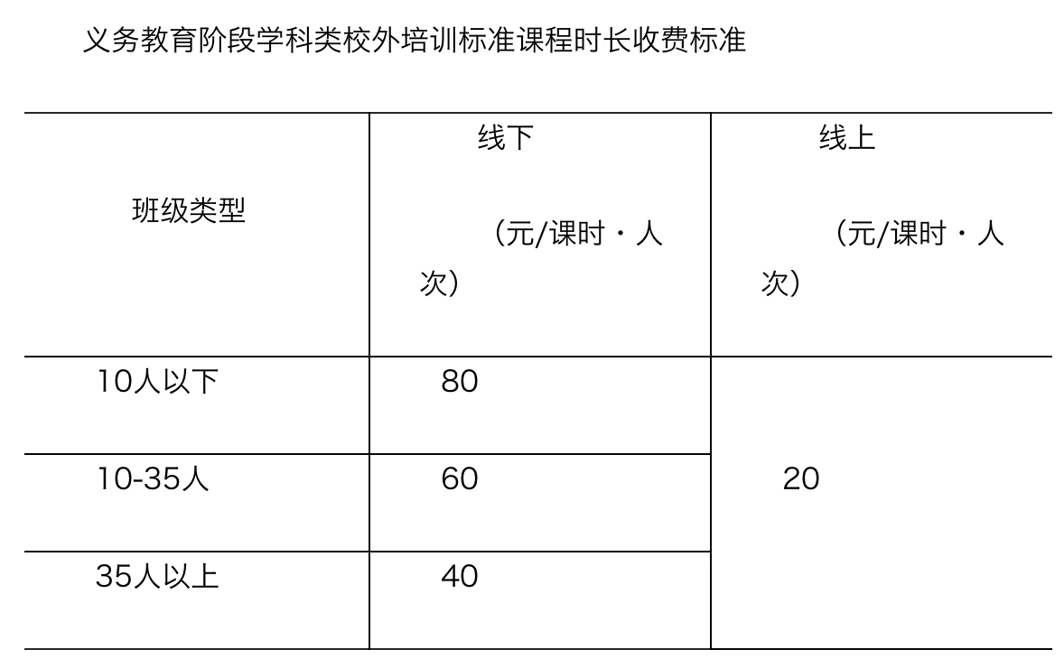 《通知》規(guī)定,10人以下、10~35人、35人以上的線下學(xué)科類校外培訓(xùn)收費(fèi)標(biāo)準(zhǔn)分別為80元、60和40元/課時(shí)/人,線上課程20元/人/課時(shí)?!锻ㄖ访鞔_,培訓(xùn)機(jī)構(gòu)可在上述收費(fèi)標(biāo)準(zhǔn)基礎(chǔ)上,在上浮不超過10%、下浮不限的范圍內(nèi)。本通知自本市中小學(xué)2022年春季學(xué)期開學(xué)(2022年2月17日)起施行。