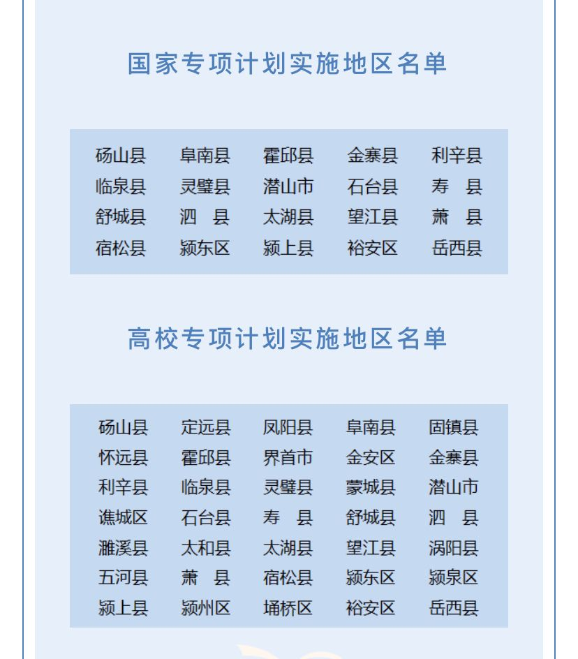 安徽省國(guó)家專項(xiàng)計(jì)劃實(shí)施區(qū)域?yàn)榘不帐≡腥雵?guó)家集中連片特殊困難縣和國(guó)家級(jí)扶貧開發(fā)重點(diǎn)縣,共20個(gè)。報(bào)考考生須同時(shí)具備下列條件:(1)符合2022年統(tǒng)一高考報(bào)名條件;(2)本人具有實(shí)施區(qū)域當(dāng)?shù)剡B續(xù)3年以上戶籍,其父親或母親或法定監(jiān)護(hù)人具有當(dāng)?shù)貞艏?(3)本人具有戶籍所在縣高中連續(xù)3年學(xué)籍并實(shí)際就讀;(4)高考成績(jī)達(dá)到報(bào)考院校所在批次線下20分以內(nèi)的考生。