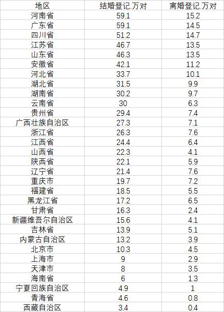 分省份來(lái)看,有10個(gè)省份結(jié)婚人數(shù)達(dá)到或超過(guò)30萬(wàn)對(duì),分別是河南、廣東、四川、江蘇、山東、安徽、河北、湖北、湖南、云南,其中河南、廣東和四川均超過(guò)50萬(wàn)對(duì),廣東和河南均為59.1萬(wàn)對(duì),并列第一。