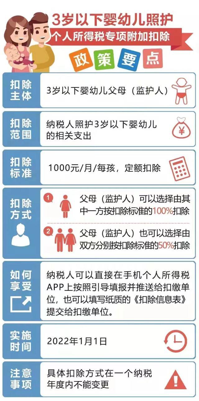 四、3歲以下嬰幼兒照護個人所得稅專項附加扣除自2022年1月1日起實施。