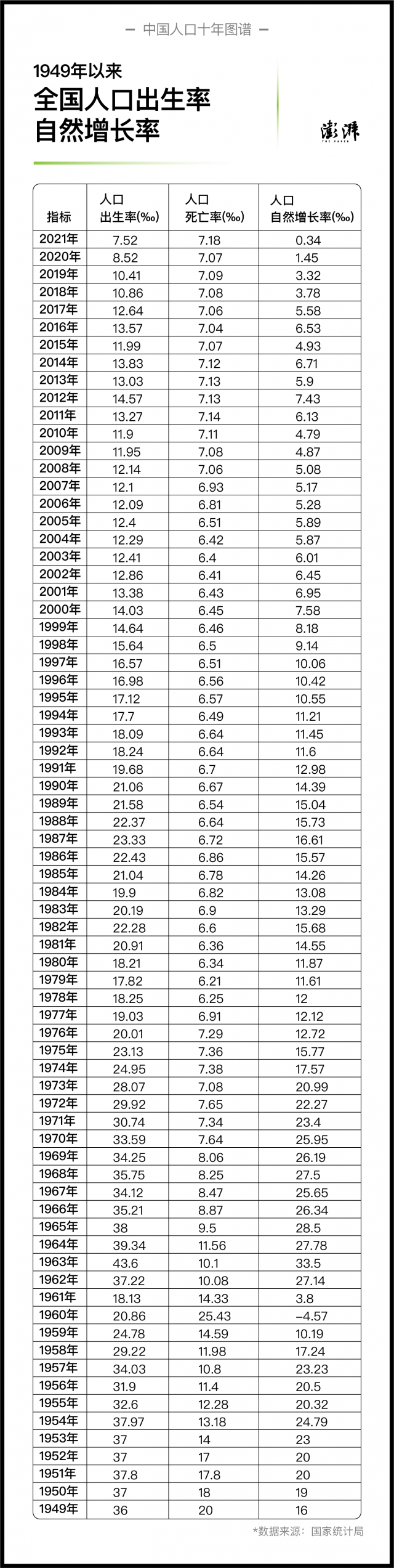 1949年以來全國人口出生率、人口自然增長率 制圖 澎湃新聞 晁嘉笙、彭艷秋