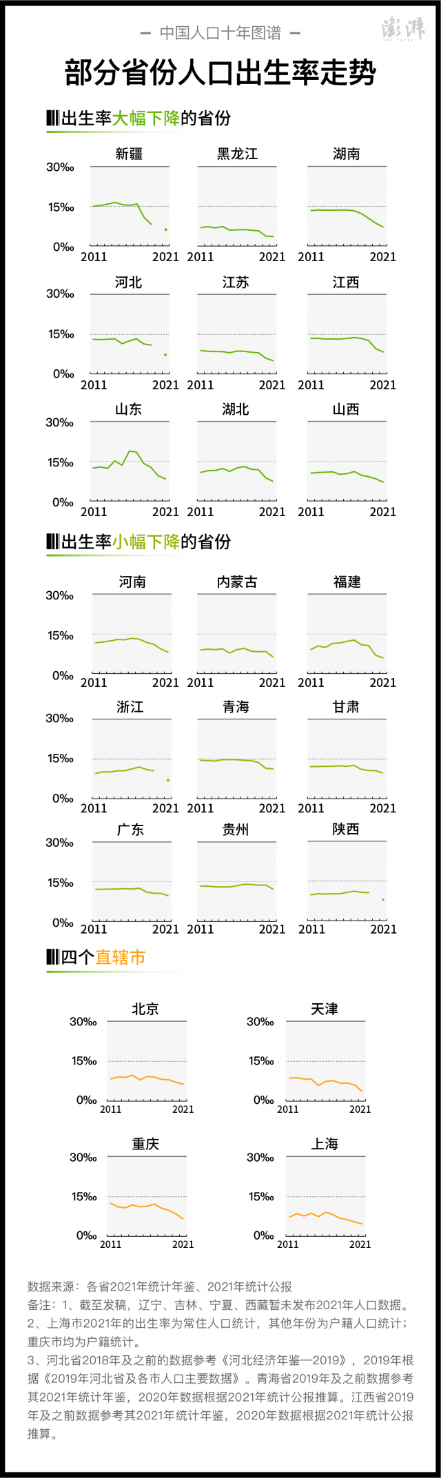 從出生率來看,已公布的省份中,2021年排在前三的省份為貴州省、青海省、甘肅省,分別為12.17‰、11.22‰、9.68‰;黑龍江省、上海市、江蘇省,為公布省份中2021年生育率最低的三省市,分別為3.59‰、4.67‰、5.7‰。2011年,出生率排在前三的省區(qū)為西藏、新疆、青海(注:海南由于統(tǒng)計(jì)年鑒未公布這一年的出生率未計(jì)入),分別為15.39‰、14.99‰、14.43‰。