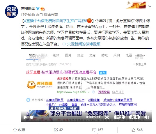 虎牙等直播平臺被央視點名:網課內容到處充斥游戲廣告