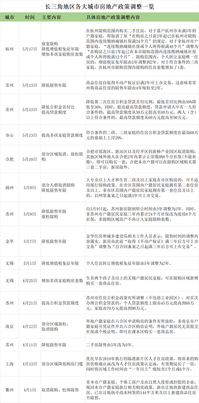 5月17日,杭州發(fā)布《關(guān)于進(jìn)一步促進(jìn)房地產(chǎn)市場平穩(wěn)健康發(fā)展的通知》,政策的主要亮點是放寬限購、降低增值稅免征年限、增加三孩家庭購房套數(shù)等。