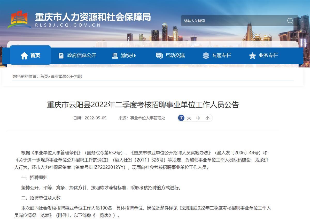 記者從重慶市人力資源和社會保障局官方網站看到,今年2月,重慶市云陽縣事業(yè)單位2022年一季度公開招聘工作人員簡章發(fā)布。該次公開招聘工作人員88名。崗位情況一覽表顯示,招聘崗位集中于該縣多家醫(yī)院、縣疾控中心、鄉(xiāng)鎮(zhèn)和街道衛(wèi)生院,還有部分單位的綜合管理崗位。縣級醫(yī)院基本要求本科以上學歷及相應學位,并對資格證書提出要求,鄉(xiāng)鎮(zhèn)和街道衛(wèi)生院的崗位基本要求大專以上學歷。該次招聘共吸引了超過千人報考,已于5月19日至20日進行現(xiàn)場資格審查。