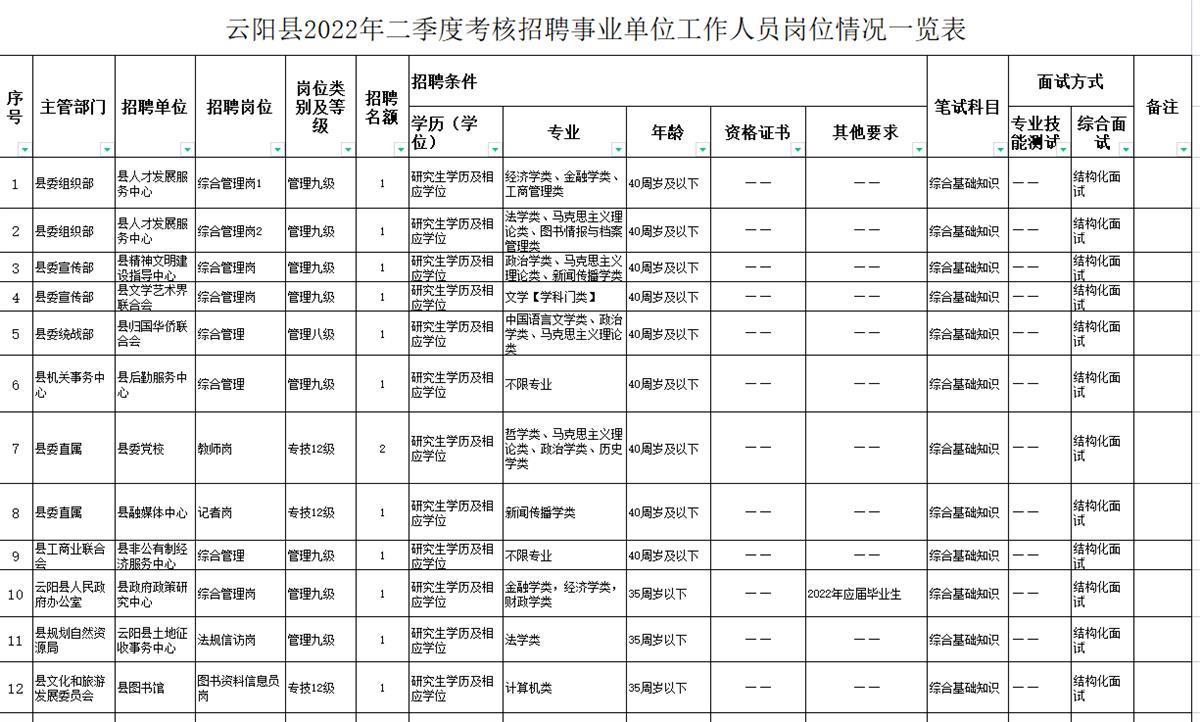 2022-05-22 08:35:07閱讀()互聯(lián)網近日,重慶云陽縣發(fā)布2022年二季度考核招聘事業(yè)單位工作人員公告,引起大量網友關注。極目新聞記者注意到,本次招聘工作人員190名,其中176個名額要求碩士生學歷及相應學位,直到報名截止前一天,仍有73個崗位無人報名。其中一家用人單位回復,如最終無人報名,招聘崗位可能會取消。