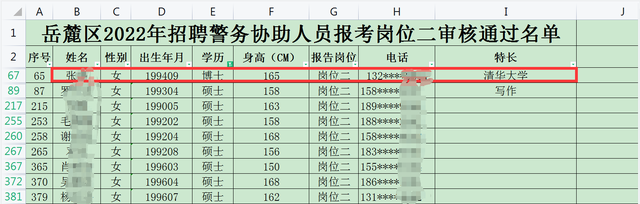據(jù)長沙市岳麓區(qū)于5月21日中午12點公布的《岳麓區(qū)2022年招聘警務協(xié)助人員報考審核通過名單公告》顯示,在通過“警務協(xié)助人員崗位二”審核的人員表格中,出現(xiàn)了眾多本科碩士人員,其中最高學歷為一位1994年出生的張姓女博士(特長備注為“清華大學”),另有研究生10人,本科349人。公告顯示,名單中人員已完成警務協(xié)助人員報名和資格審查,將按照要求參加體能測試。不過,據(jù)@九派新聞報道,23日,岳麓區(qū)相關(guān)人員表示,該張姓博士系在校生,不符合招聘條件,因此遺憾未被錄取。