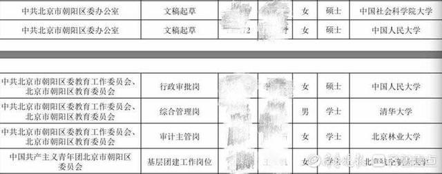 此外,記者從公示信息了解到,3名博士中有2名來自北京大學,另一名來自北京師范大學。其中一名北大博士擬錄取崗位為市場監(jiān)督管理局綜合管理崗,另一名北大博士的擬錄取崗位為某街道的城市管理執(zhí)法崗。