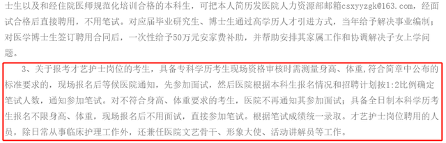 值得注意的是,該崗位在“其他條件”中要求:“??茖W歷考生須先面試、再筆試;要求具有一定才藝特長,形象氣質(zhì)佳,普通話標準,身高162cm以上,體重指數(shù)(BMI):18.5—24.9之間”,但“全日制本科學歷考生不需面試,直接參加筆試;身高、體重不限”;往屆生須具有護士執(zhí)業(yè)資格證書(或成績合格證),應屆生暫時不限執(zhí)業(yè)證書,但當年必須參加護士執(zhí)業(yè)資格考試并成績合格,否則不予錄用。”