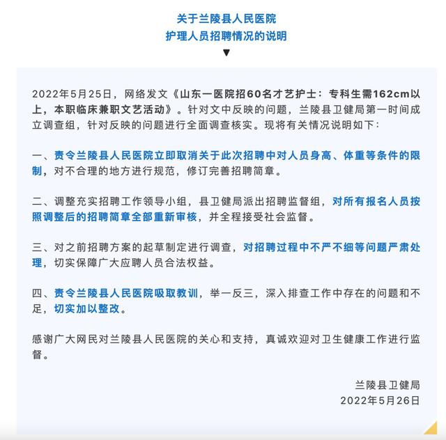 5月26日晚間,蘭陵縣衛(wèi)健局針對此事發(fā)布說明稱,取消關于此次招聘中對人員身高、體重等條件的限制,對招聘過程中不嚴不細等問題嚴肅處理。