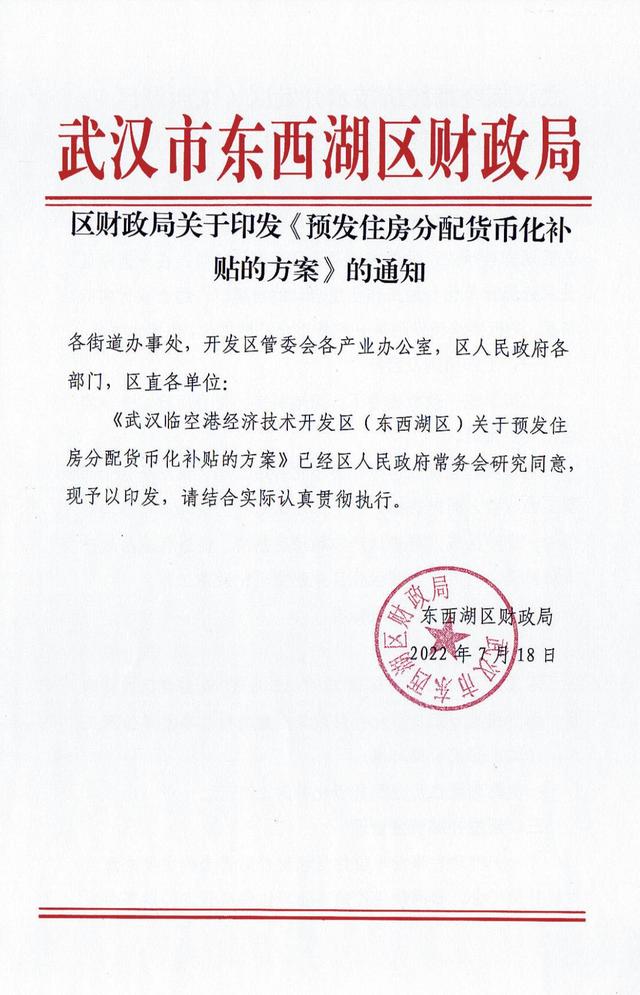 2022-07-25 17:50:21閱讀()互聯(lián)網(wǎng)7月18日,武漢市東西湖區(qū)財政局印發(fā)《預(yù)發(fā)住房分配貨幣化補(bǔ)貼的方案》的通知,稱將向符合條件的行政事業(yè)單位購房職工一次性預(yù)發(fā)補(bǔ)貼15萬元。對此,武漢市東西湖區(qū)財政局一位工作人員表示,這部分補(bǔ)貼為預(yù)發(fā)放,未來5年內(nèi)會從收入中進(jìn)行扣除。