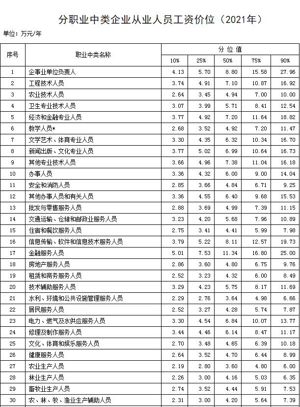 2022-09-19 19:15:35閱讀()人社部人社部近日發(fā)布2021年企業(yè)薪酬調(diào)查信息,披露了分職業(yè)中類企業(yè)從業(yè)人員以及分崗位等級企業(yè)從業(yè)人員的工資價位。