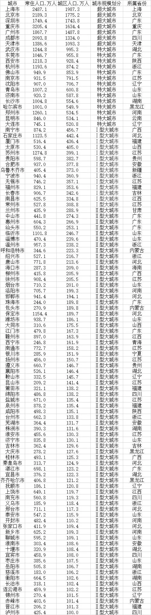 城區(qū)人口是衡量城市規(guī)模的標(biāo)準(zhǔn)。根據(jù)2014年11月國務(wù)院發(fā)布的《關(guān)于調(diào)整城市規(guī)模劃分標(biāo)準(zhǔn)的通知》,以城區(qū)常住人口為統(tǒng)計口徑,將城市劃分為五類七檔。其中,城區(qū)常住人口100萬以上500萬以下的城市為大城市,其中300萬以上500萬以下的城市為Ⅰ型大城市,100萬以上300萬以下的城市為Ⅱ型大城市;城區(qū)常住人口500萬以上1000萬以下的城市為特大城市;城區(qū)常住人口1000萬以上的城市為超大城市。