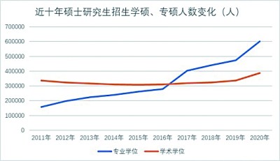 在相關(guān)政策的推動(dòng)下,碩士研究生招生總?cè)藬?shù)中,專碩招生人數(shù)增長(zhǎng)明顯。2017年起,專碩招生人數(shù)突破40萬(wàn),首次超過(guò)學(xué)碩招生人數(shù)。到2020年專碩招生人數(shù)超過(guò)60萬(wàn)人,并與學(xué)碩招生人數(shù)之間差距逐漸拉大。