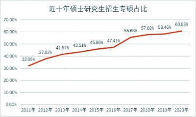 近十年碩士研究生招生中,專碩占比逐年提升,2020年占比超過(guò)60%。