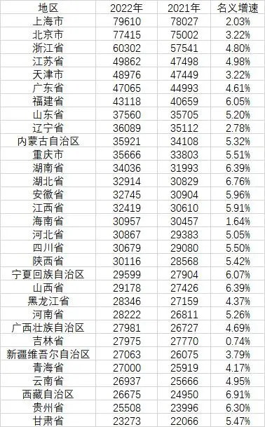 國家統(tǒng)計局公布:31省2022年人均收入
