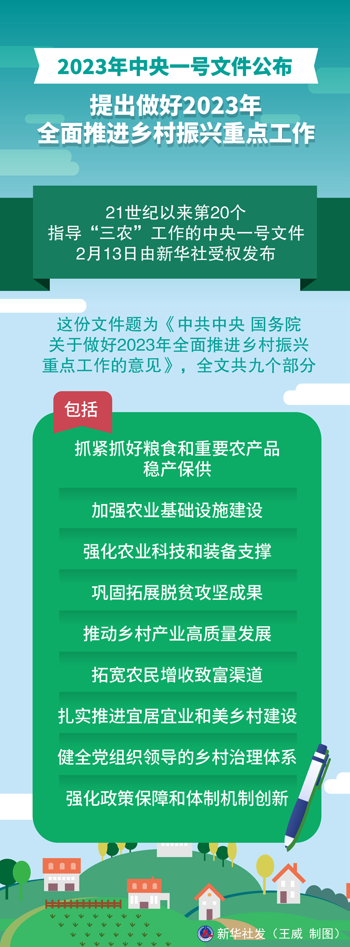這份文件題為《中共中央 國(guó)務(wù)院關(guān)于做好2023年全面推進(jìn)鄉(xiāng)村振興重點(diǎn)工作的意見(jiàn)》,全文共九個(gè)部分,包括:抓緊抓好糧食和重要農(nóng)產(chǎn)品穩(wěn)產(chǎn)保供、加強(qiáng)農(nóng)業(yè)基礎(chǔ)設(shè)施建設(shè)、強(qiáng)化農(nóng)業(yè)科技和裝備支撐、鞏固拓展脫貧攻堅(jiān)成果、推動(dòng)鄉(xiāng)村產(chǎn)業(yè)高質(zhì)量發(fā)展、拓寬農(nóng)民增收致富渠道、扎實(shí)推進(jìn)宜居宜業(yè)和美鄉(xiāng)村建設(shè)、健全黨組織領(lǐng)導(dǎo)的鄉(xiāng)村治理體系、強(qiáng)化政策保障和體制機(jī)制創(chuàng)新。