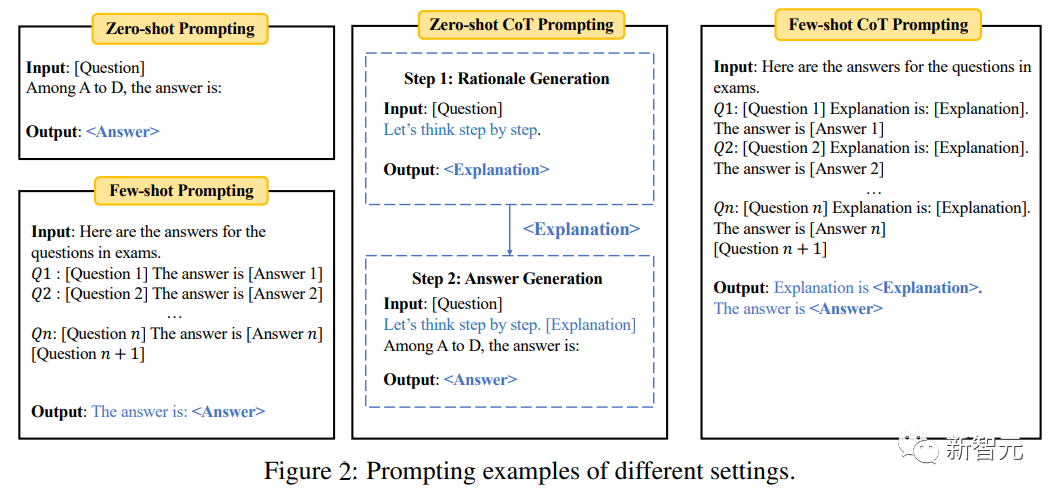 為了進一步測試模型的推理能力,實驗中還引入思維鏈(CoT)提示,即先輸入提示「Let’sthinkstepbystep」為給定的問題生成解釋,然后輸入提示「Explanationis」根據(jù)解釋生成最終的答案。