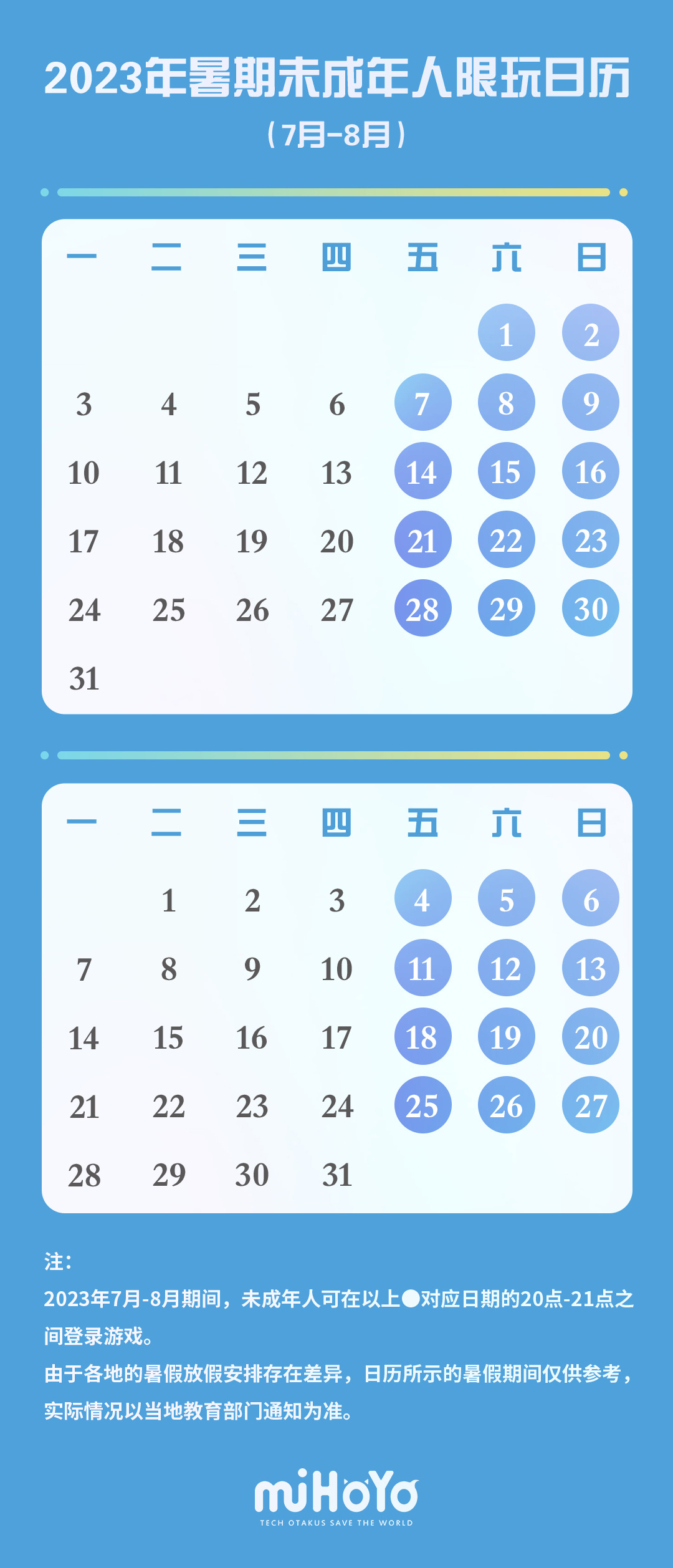 2023-06-29 15:03:05閱讀()互聯(lián)網(wǎng)6月29日消息,騰訊、網(wǎng)易、米哈游今日發(fā)布2023年暑假未成年人限玩通知,未成年人暑假每周僅能周五六日20時至21時之間限玩游戲1小時,其余均為禁玩時段。