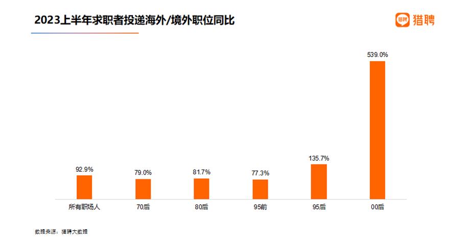 在人才出海、出境就業(yè)方面,獵聘發(fā)布的報告稱,隨著去年底疫情管控措施的放開,人才跨區(qū)域、跨境恢復往日的便利。2023上半年求職者投遞海外/境外職位同比去年同期增長92.9%。