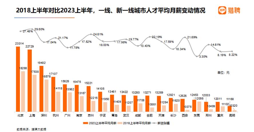 2023-07-25 17:55:34閱讀()中新經(jīng)緯7月25日電 日前,同道獵聘旗下獵聘發(fā)布《2023上半年人才流動與薪酬趨勢報告》,報告顯示,從2023年上半年趨勢來看,越來越多的年輕人正涌向新一線城市。2023年人才投遞熱門城市前三分別為上海、北京和深圳。薪資方面,北京平均月薪18976元全國最高,而上海近六年來薪資漲幅最高,達29.6%。