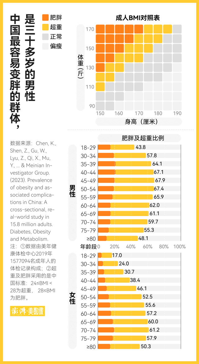 根據(jù)中國人的體質,成年人的 BMI 指數(shù)(體重(千克)/【身高(米)的平方】)分別達到 24 和 28 時,就是超重和肥胖?;谶@一標準,近期發(fā)表于學術期刊《糖尿病、肥胖與代謝》上的一篇名為《中國肥胖患病率及相關并發(fā)癥:1580 萬成年人的橫斷面真實世界研究》論文,就統(tǒng)計出了中國的整體發(fā)胖情況:有 34.8% 的人超重,另外還有 14.1% 的人有更嚴重的肥胖問題。