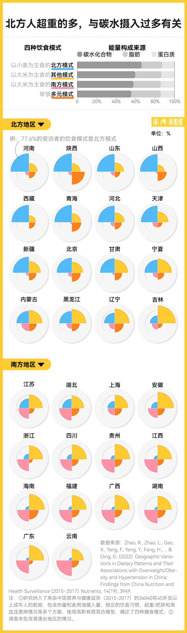 其中,北方膳食模式相對其他模式,有更多的能量是來自碳水化合物(超過 60%),研究認為這可能就導致了北方地區(qū)的超重和肥胖風險更高。