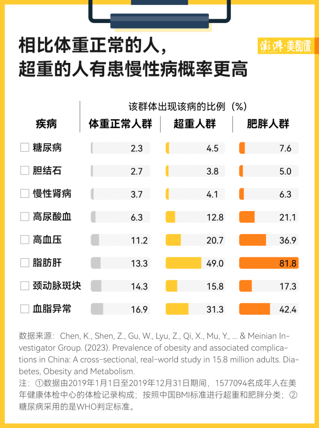 根據(jù)母義明團隊的研究,在超重和肥胖的群體中,有至少 1 種慢性病的比例,分別在 70.7% 和 89.1%,高于BMI 正常者的 41.7%。其中,肥胖最常見的并發(fā)癥是脂肪肝(34.9%)、糖尿病前期(27.6%)和血脂異常(24.9% )。而且因為肥胖,這些曾經(jīng)人們眼中的“老年病”,如今慢慢也找上了體重較高的年輕人。