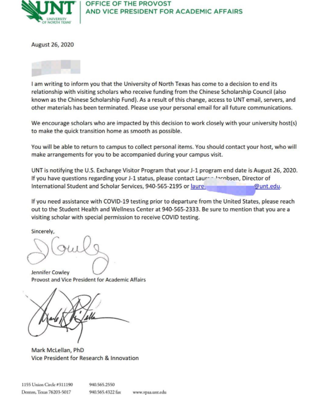 這封郵件截圖還顯示,該校也將此事告知了美國政府的相關(guān)簽證部門,表示這些中國公派訪問學(xué)生學(xué)者的學(xué)習(xí)項目已在8月26日當天結(jié)束。
