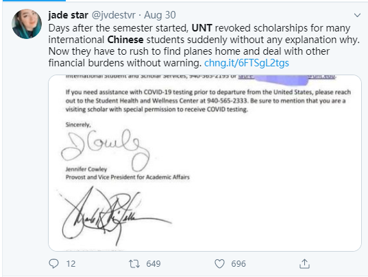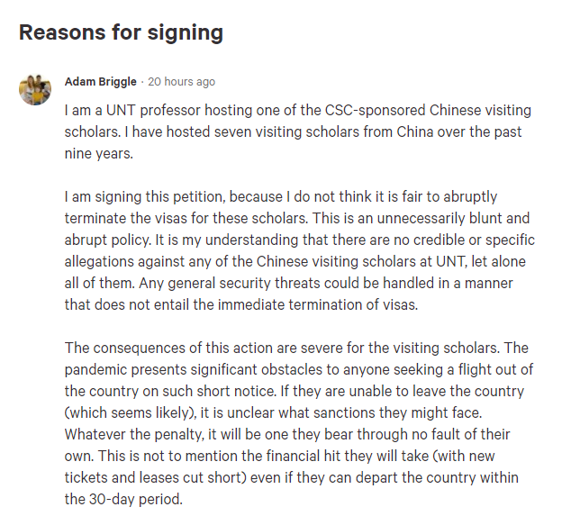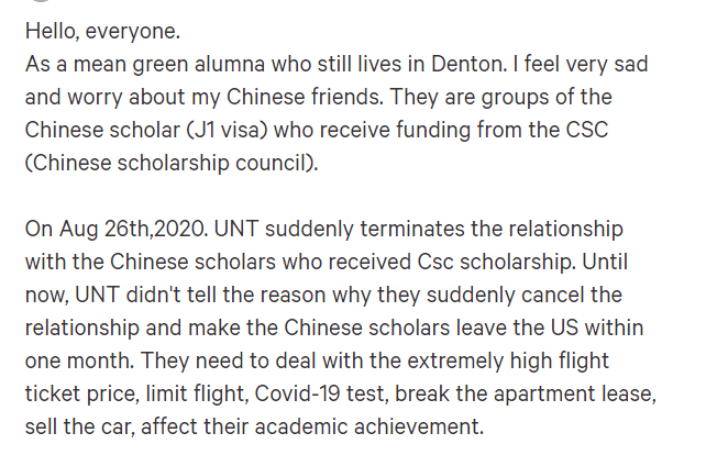 在美國請愿類信息網(wǎng)站“Change.org”上,一則為北得克薩斯州大學(xué)的中國留學(xué)生求助的網(wǎng)貼就表示,該校是在8月26日當天突然宣布中止受中國國家留學(xué)基金委員會資助的訪問學(xué)生和學(xué)者的學(xué)習(xí)資格的,并要求這些持有J-1類簽證的中國公派留學(xué)生和學(xué)者在1個月內(nèi)離境。可該校至今也沒有透露這么做的原因是什么。