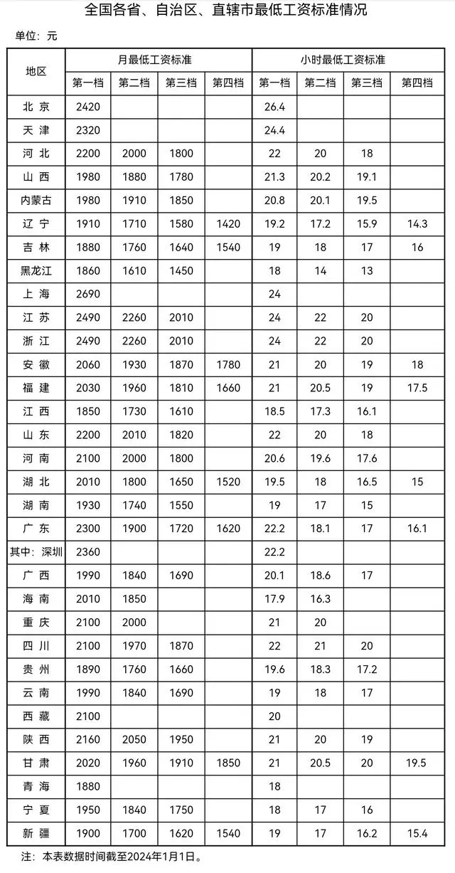 2024-01-22 16:12:05閱讀()人社部近日,人社部官網(wǎng)發(fā)布了全國(guó)各省、自治區(qū)、直轄市最低工資標(biāo)準(zhǔn)情況(截至2024年1月1日)。從月最低工資標(biāo)準(zhǔn)來(lái)看,上海以2690元位居全國(guó)首位。從小時(shí)最低工資標(biāo)準(zhǔn)來(lái)看,北京以26.4元排名第一。2024年以來(lái),江蘇、浙江、遼寧等多個(gè)省份宣布上調(diào)最低工資標(biāo)準(zhǔn),其中,遼寧將從2024年5月1日起上調(diào)最低工資標(biāo)準(zhǔn)。