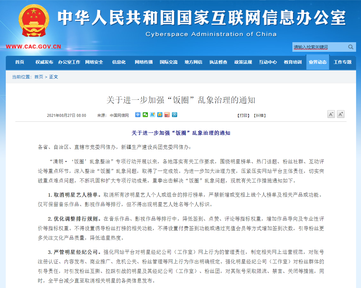 網信辦整治飯圈亂象:取消明星藝人榜單/優(yōu)化調整排行規(guī)則/嚴禁呈現互撕信息