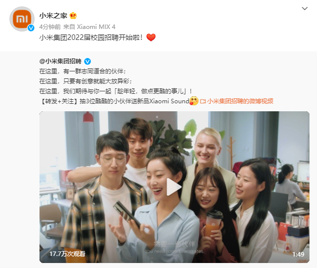 小米集團2022全球校園招聘啟動:提供軟硬件開發(fā)等11個崗位