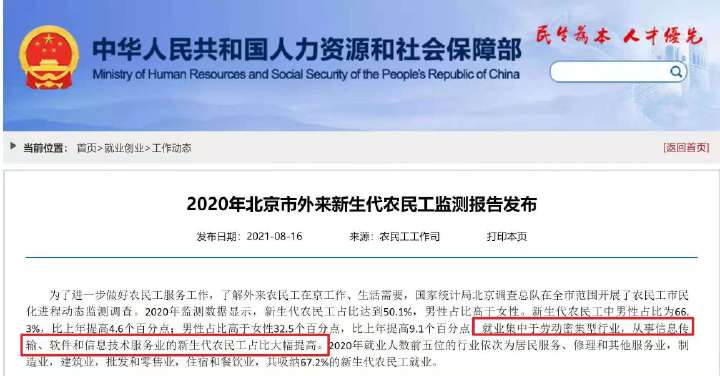 據(jù)人力資源和社會保障部8月16日發(fā)布的信息,2020年北京市外來新生代農(nóng)民工監(jiān)測報告已于近日發(fā)布。報告提到,為進(jìn)一步做好農(nóng)民工服務(wù)工作, ...