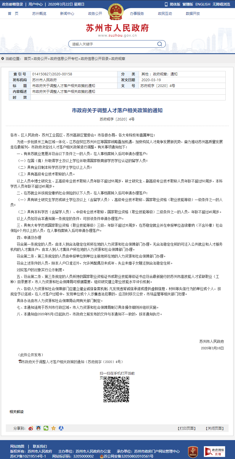 據(jù)江蘇省蘇州市政府官網(wǎng),20日,蘇州市政府發(fā)布關(guān)于調(diào)整人才落戶相關(guān)政策的通知,包括具有全日制本科學(xué)歷及學(xué)士學(xué)位以上人員即可申請(qǐng)落戶等 ...