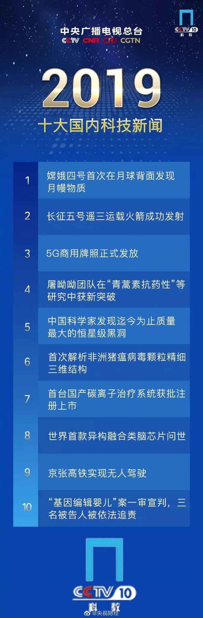 1月1日凌晨,中央廣播電視總臺發(fā)布了2019十大國內(nèi)國際科技新聞。2019十大國內(nèi)科技新聞包括:嫦娥四號首次在月球背面發(fā)現(xiàn)月幔物質(zhì)、長征五號 ...