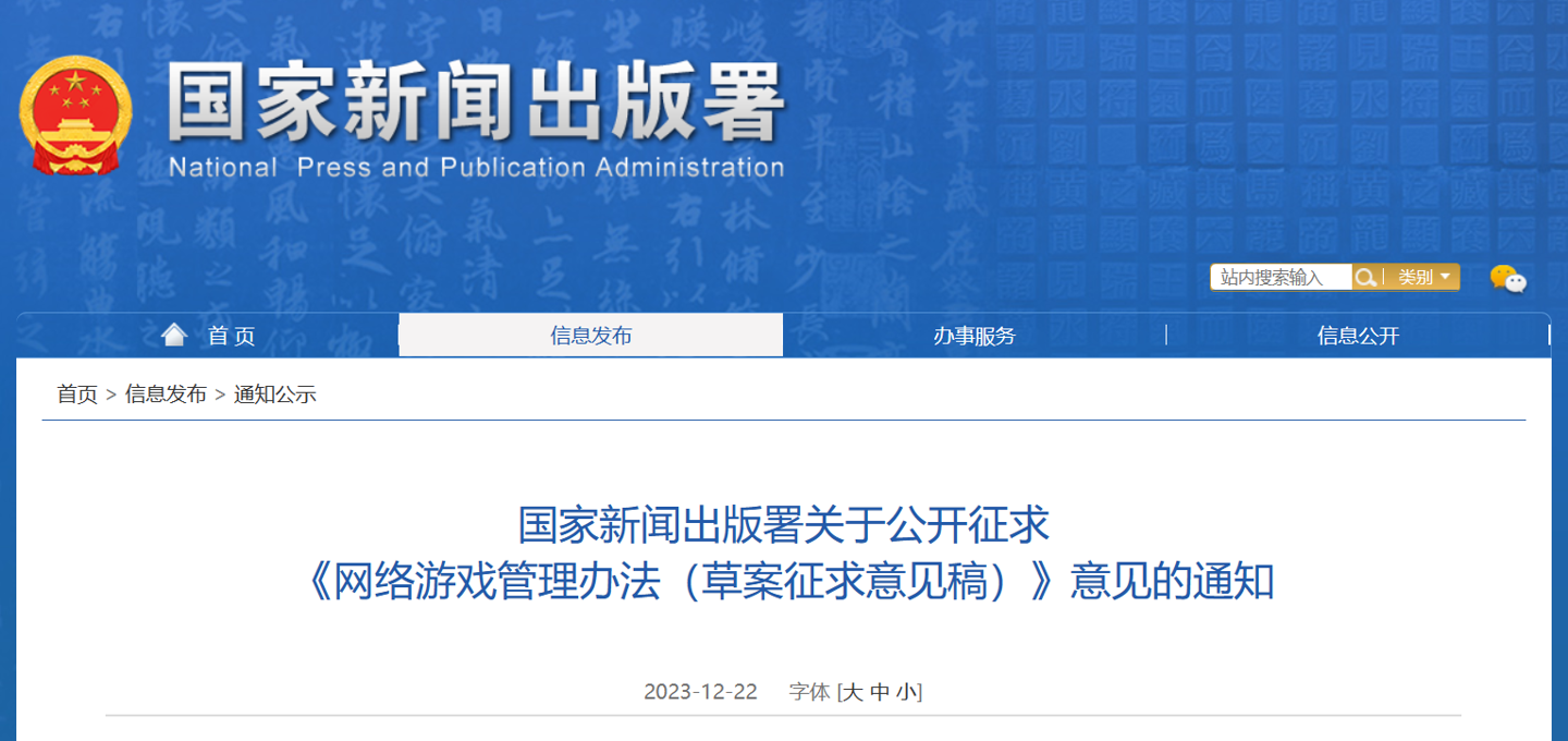 12月22日消息,國家新聞出版署今日發(fā)布《網(wǎng)絡(luò)游戲管理辦法(草案征求意見稿)》,現(xiàn)向社會(huì)公開征求意見。文件中提到,網(wǎng)絡(luò)游戲不得設(shè)置每日 ...