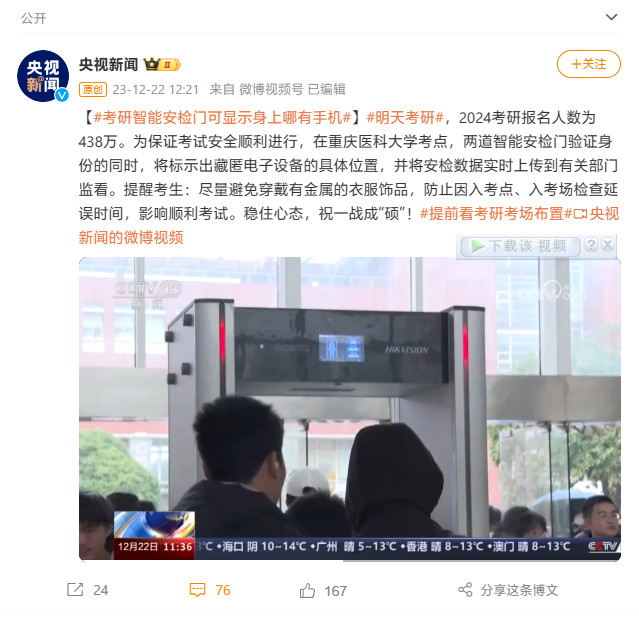 明天(12月23日),2024年全國碩士研究生招生考試將正式開考。據(jù)央視新聞,今年多個(gè)省份在考研須知中明確表示,考生入場時(shí)將新增智能安全門檢 ...