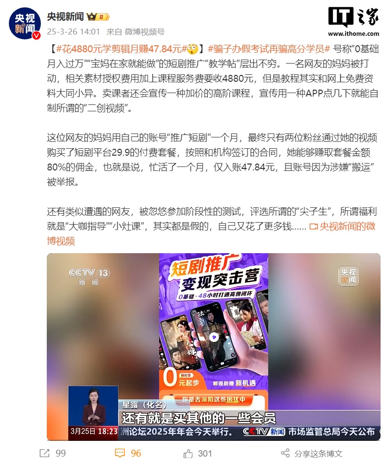 央視曝光短劇推廣騙局套路,花4880元學(xué)剪輯月賺47.84元