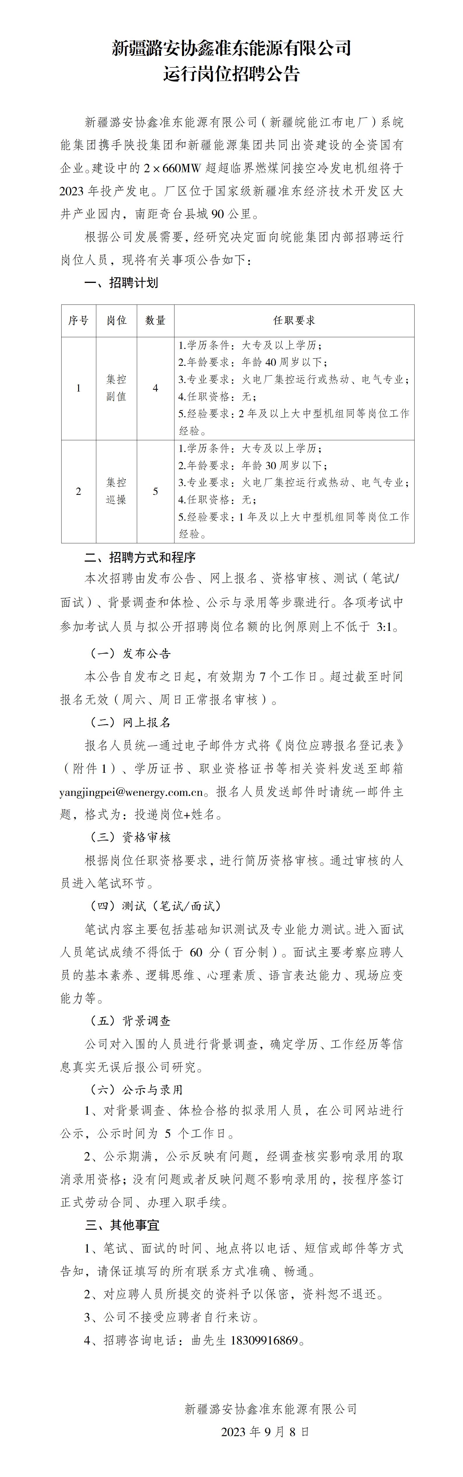 根據(jù)公司發(fā)展需要,經(jīng)研究決定面向皖能集團內(nèi)部招聘運行崗位人員,現(xiàn)將有關(guān)事項公告如下: