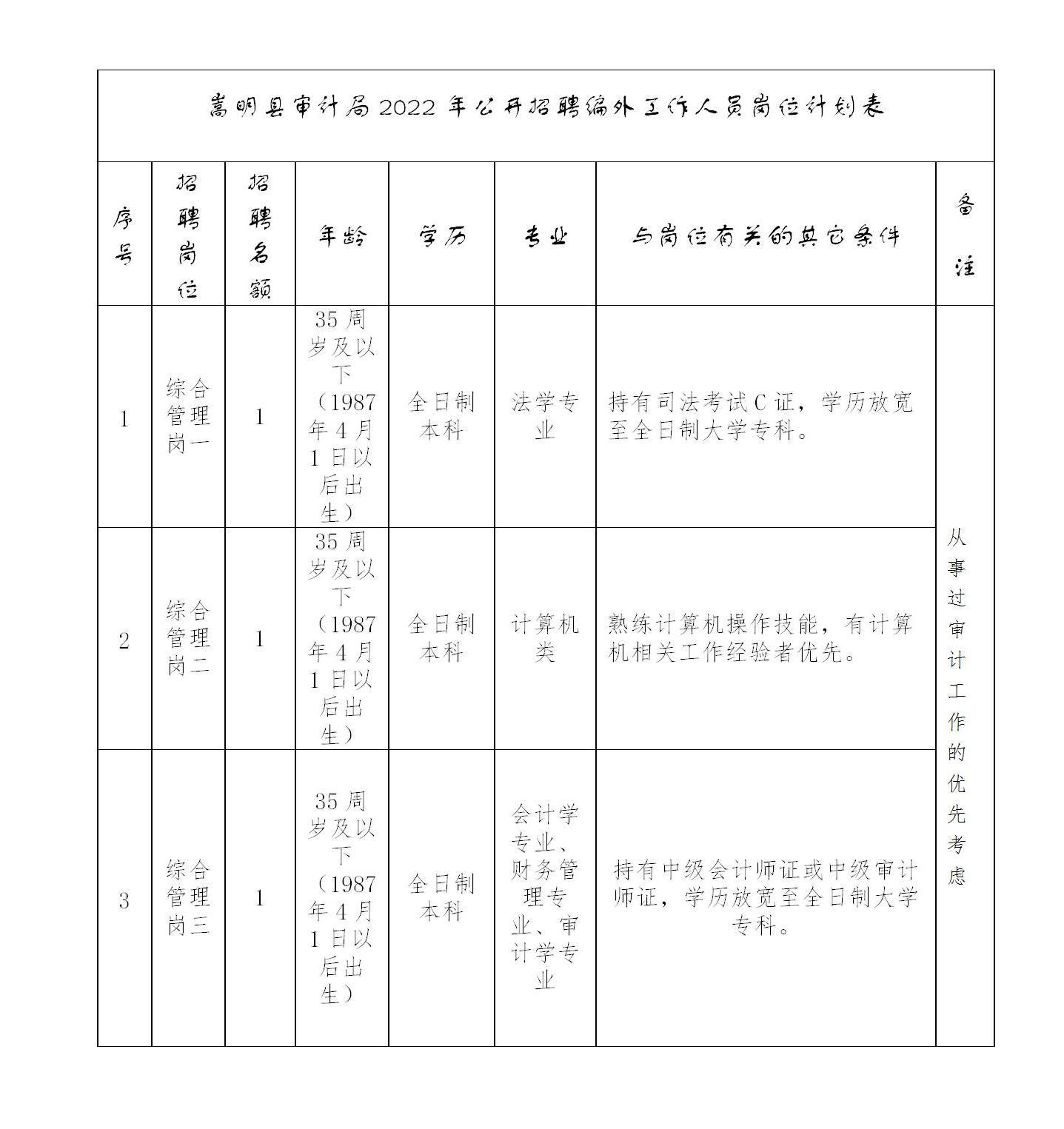 2022-04-07 00:04:34閱讀()昆明公共招聘網(wǎng)嵩明縣審計局為保障重點工作順利推進,滿足本單位相關(guān)崗位用人需要,現(xiàn)委托嵩明嘉益人力資源有限公司通過合規(guī)和高效的招聘程序,引進具有專業(yè)知識技能及符合單位用人標(biāo)準的優(yōu)秀人才,結(jié)合當(dāng)前工作實際,面向社會公開招聘編外工作人員。具體招聘事項如下: