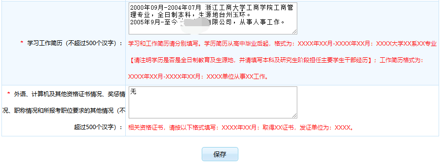 提醒:考生應(yīng)逐條填寫完整的學習、工作簡歷(請從高中開始逐一填寫至2022.4止,不要存有斷檔時限)。招聘崗位要求全日制學歷的,請在學習簡歷填寫時注明是否是全日制教育;部分崗位要求2022年普通高校應(yīng)屆畢業(yè)生的,請在學習簡歷中注明畢業(yè)時間;部分崗位要求職業(yè)(資格)證書的,請務(wù)必在其他情況中按正確的格式如實填寫完整詳細的信息。