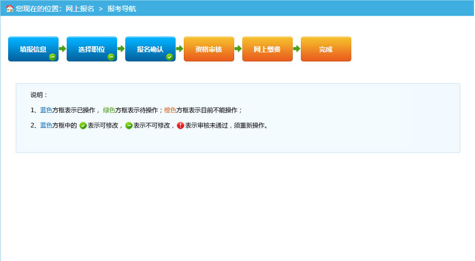 報考人員報名信息提交后,請務(wù)必進行“報名確認”操作,否則,報考單位無法進行資格審查。