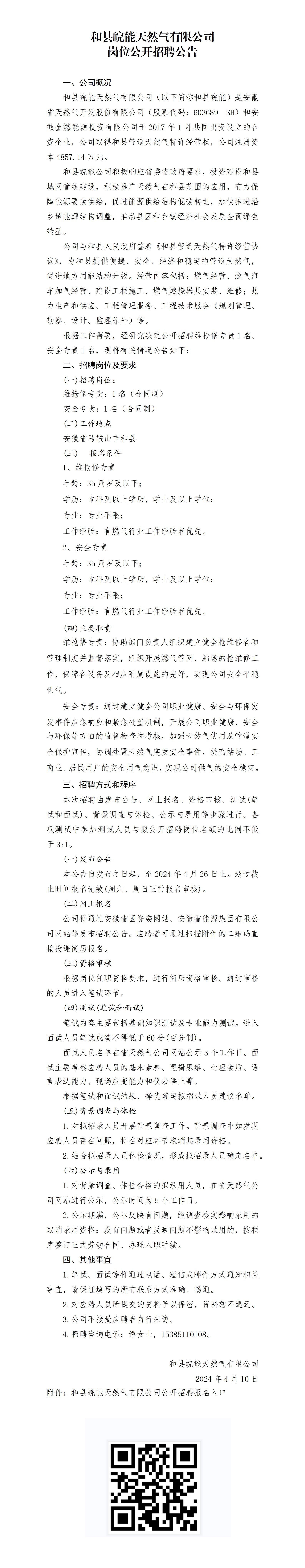 2024年馬鞍山和縣皖能天然氣有限公司崗位公開招聘公告