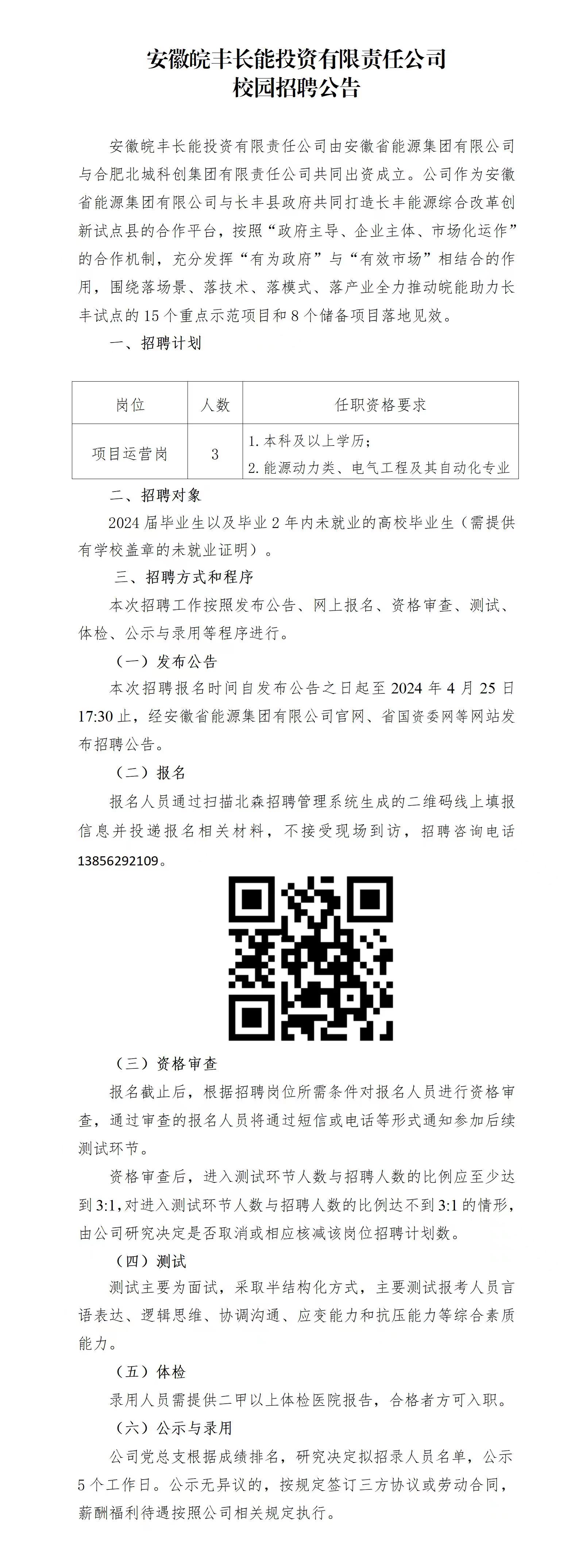 2024年安徽皖豐長(zhǎng)能投資有限責(zé)任公司校園招聘公告
