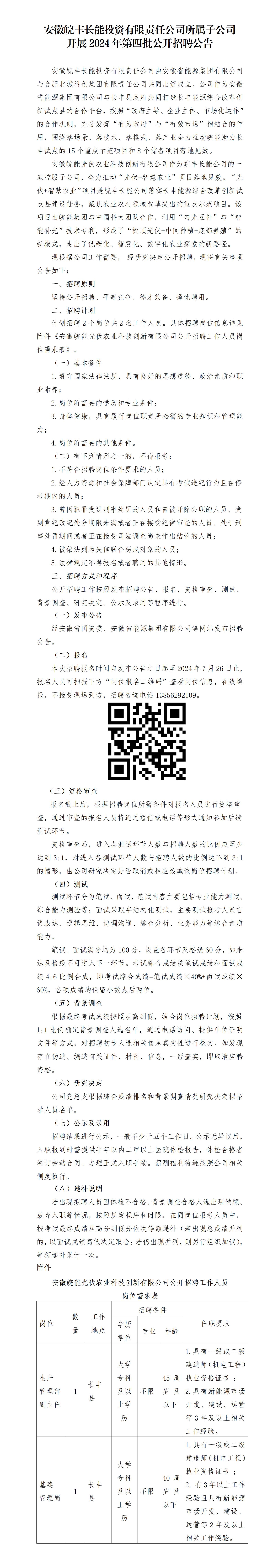 2024年安徽皖豐長(zhǎng)能投資有限責(zé)任公司所屬子公司開(kāi)展第四批公開(kāi)招聘公告