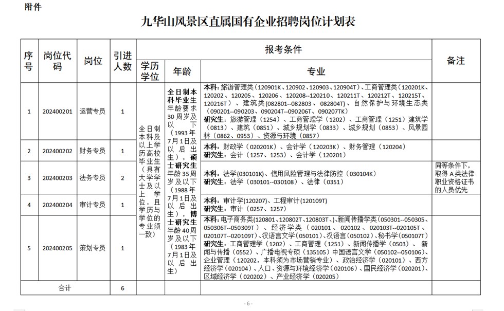 本次計劃招聘專業(yè)人員6名。具體崗位、報考條件等詳見《招聘崗位計劃表》(見附件)。