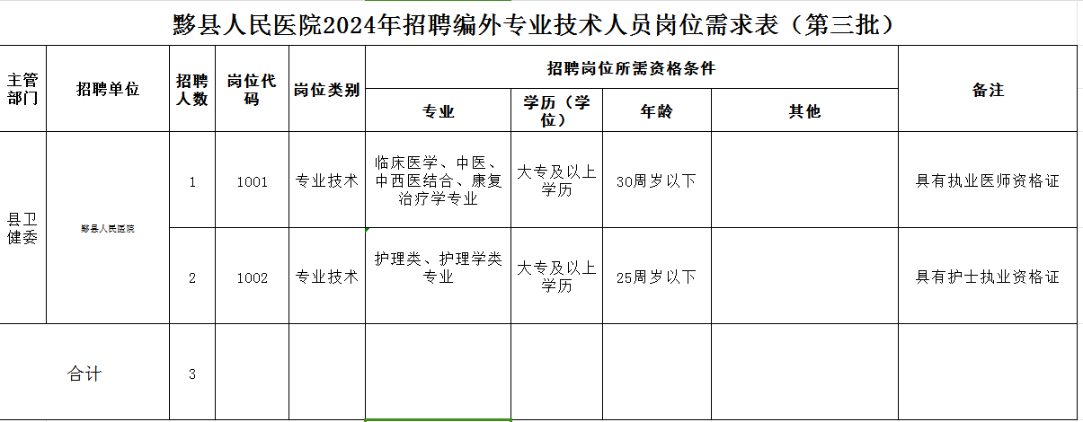 本次招聘共計(jì)2個(gè)崗位3名專業(yè)技術(shù)人員。詳見《黟縣人民醫(yī)院2024年招聘編外專業(yè)技術(shù)人員崗位需求表(第三批)》